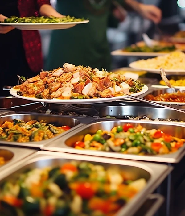 Buffet catering is a self-serve dining style where a variety of dishes are arranged for guests to choose from. It’s ideal for large events, offering flexibility, variety, and cost-efficiency. Guests can serve themselves from a selection of starters, main courses, desserts, and beverages, catering to various tastes and dietary preferences.